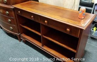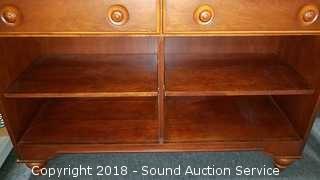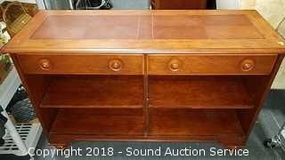 Has 2 drawers and adjustable shelves. Looks to be solid wood. Approx. 33" H x 50" W x 18"D.