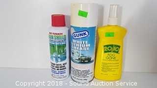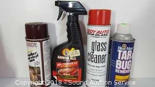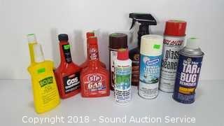 Includes: 3 NEW Bottles of STP Gas Treatment, Leather & Vinyl Care, Tar & Bug Remover, Glass Cleaner, Grease Remover, Armor All Glass Defogger, and Heat Treat. Most all feel full.
