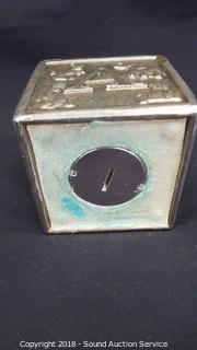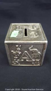 Coin bank is the shape of an alphabet block, 3" cubed. Volupte lip lock has a mirror, compact, and lipstick holder.