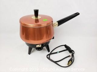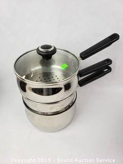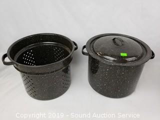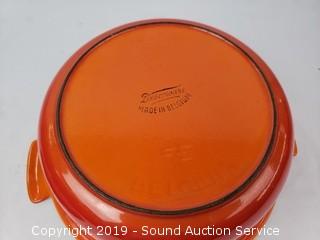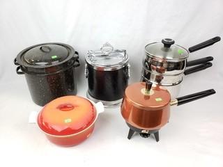 Item Description:  Dutch oven is enameled cast iron, made in  Belgium. Also includes Cooks Essentials  triple steamer, copper electric pot, ice  bucket, and speckled boiling pot.