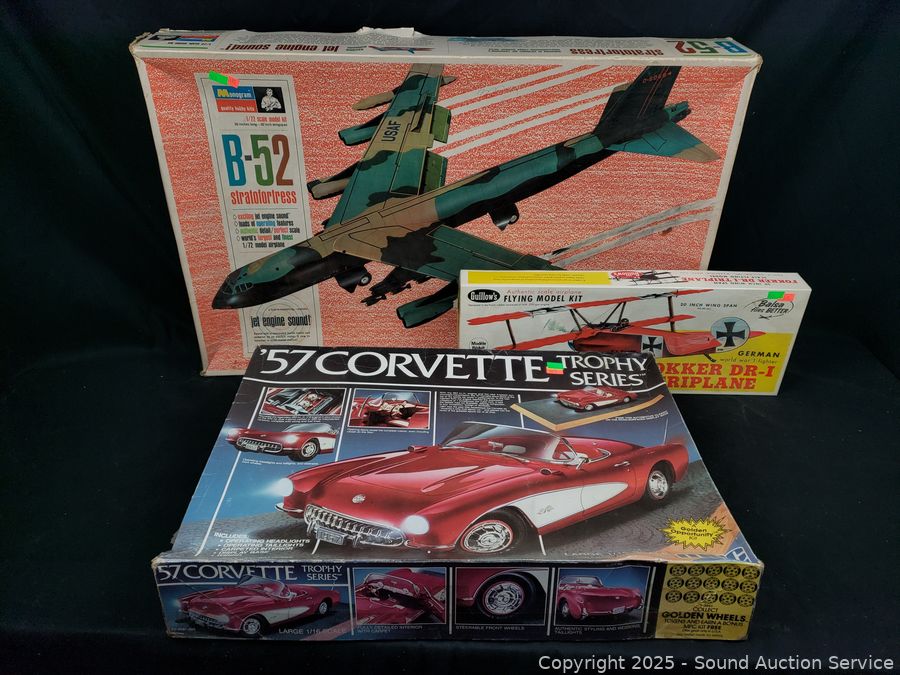 German Fokker DR-I Triplane Balsa Wood Model Kit, 57 Corvette 1:16 scale model kit, B-52 Stratofortress 1:72 scale plastic model kit. Unknown completeness.