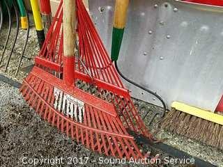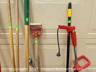 Includes rakes, ho, pitch fork, snow shovel, broom, electric weedeater, and razor teeth saw.