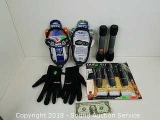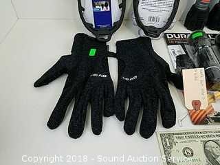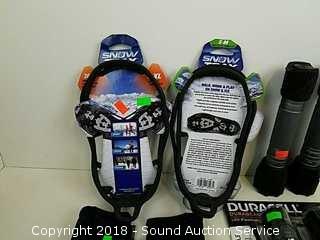 Includes: (2) sets of small Snowtrax shoes, (2) pairs ladies Head gloves, and (5) Duracell flashlights (do not come with batteries). Flashlight tested, work. Refer to photos for more information.