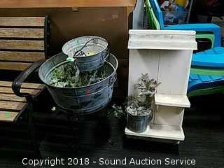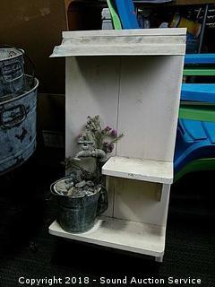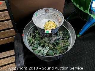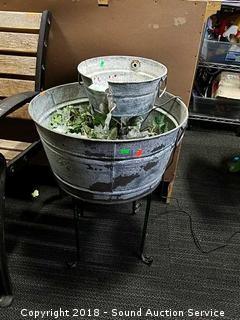 Spigot with bucket shelf fountain is approx. 31" tall, 15" wide and 10" deep. Galvanized tub fountain is approx. 26" tall, 18" x 18".
