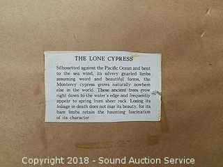 By Don Davey. Silhouetted against Pacific ocean and bent to the sea wind. Monterey Cypress, grows naturally nowhere else in the world. Has information on the back. Approx. 11-1/2" x 15".