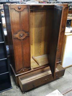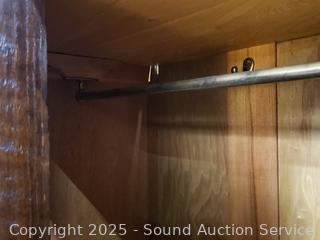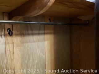 Single drawer, hanging rod & hooks, beveled mirror. Some minor scuffs, overall great condition. 69" H x 48" W x 18" D. Possibly missing something for the top.
