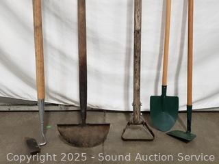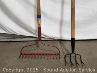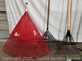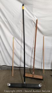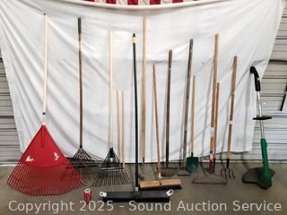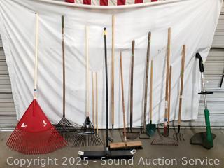 String Trimmer works, leaf rakes, 18" to 24" push broom, hoe, edger, cultivator, brush rake, scrapper, etc. Refer to photos for lot contents, more details.