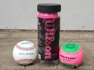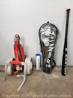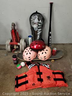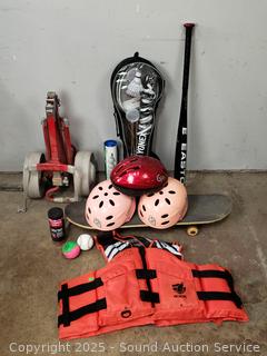 Baseball bat, baseball, skateboard, racquet balls, badminton net & racquets, birdies, helmets, folding golf cart, etc. Refer to photos for lot contents, more details.