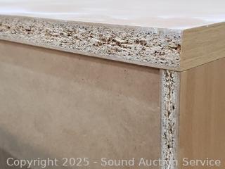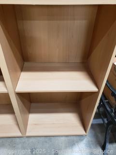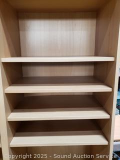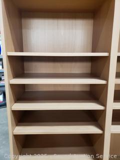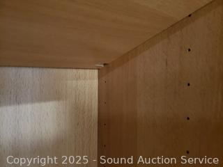 Missing one peg for a shelf. Particleboard construction, wood grain finish. In great cosmetic condition. 76.5" H x 47.5" W x 15.5" D.