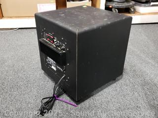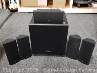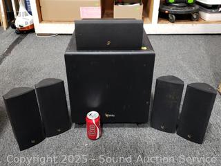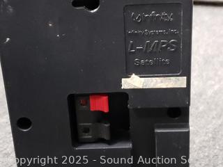 4 LMP-S Satellite speakers, 1 Minuette center speaker, BU-2 subwoofer. Small units all passing signal, sub has power, producing sound. Signs of wear from use.
