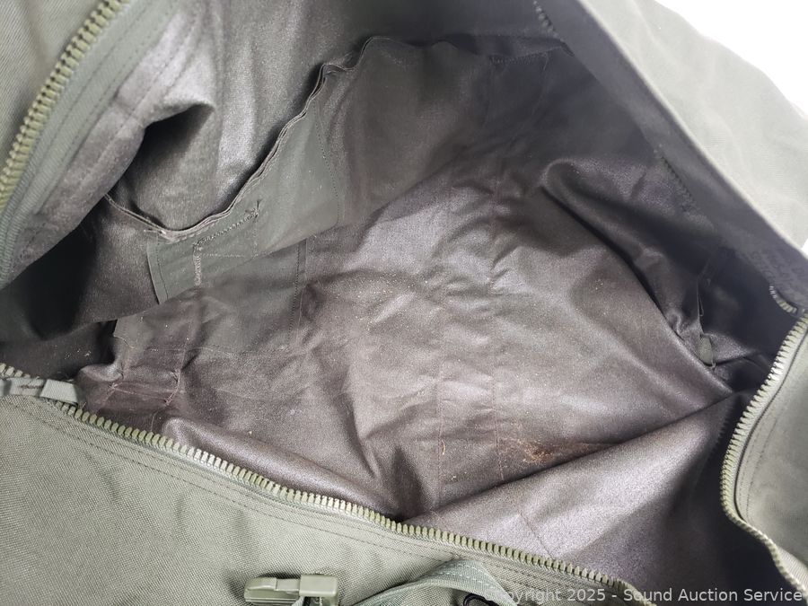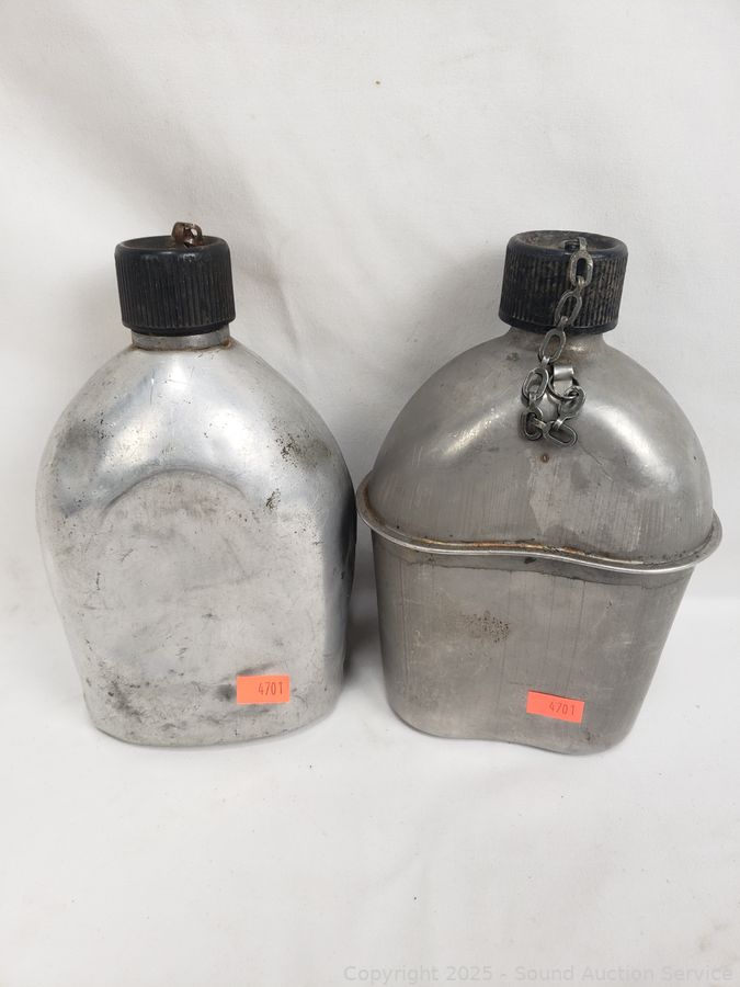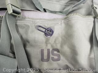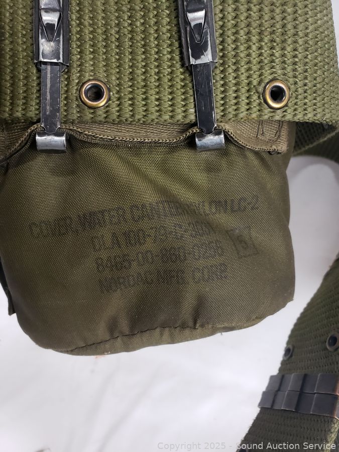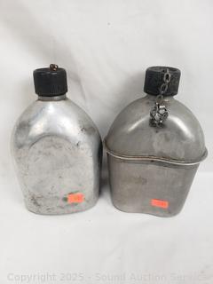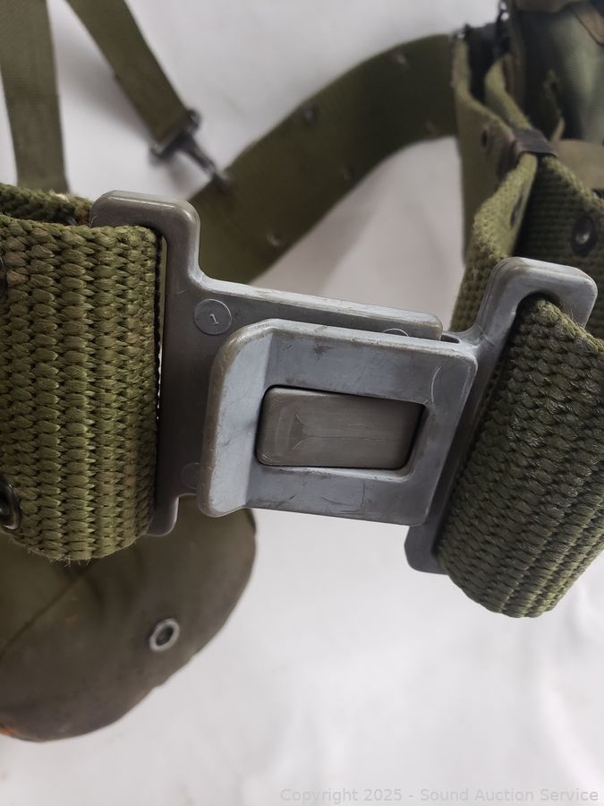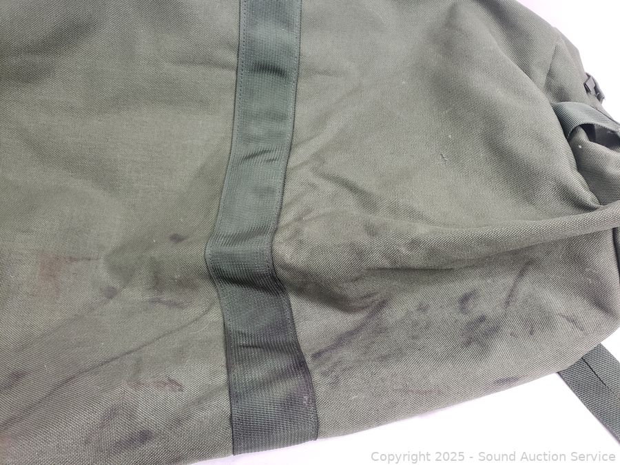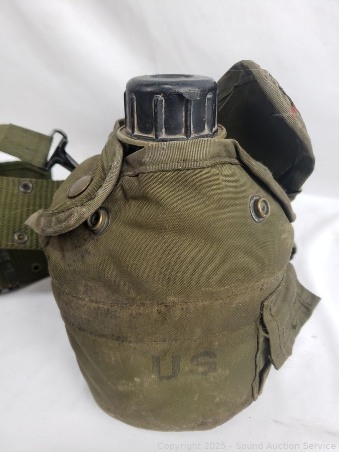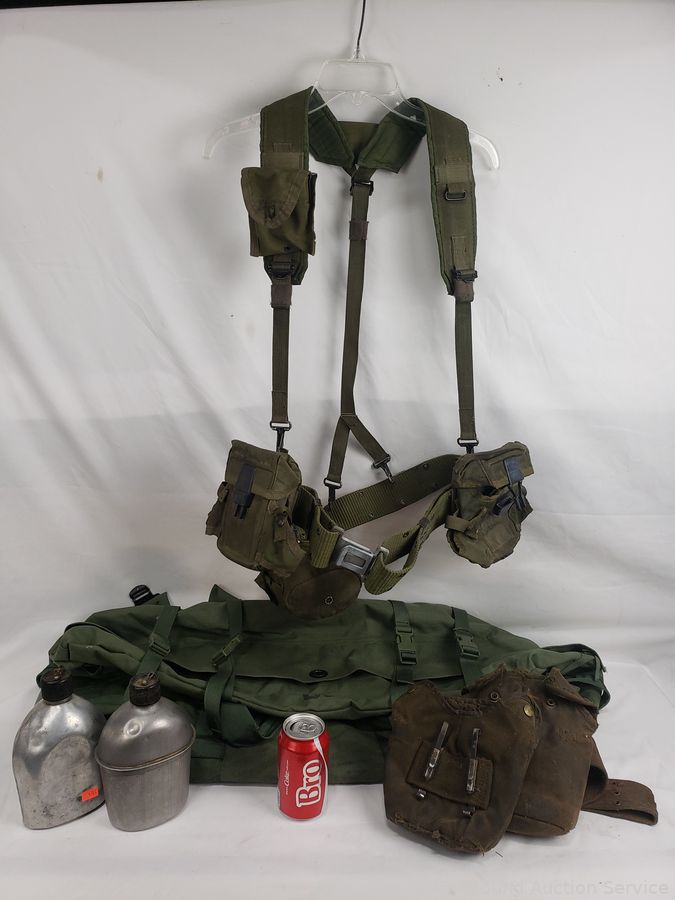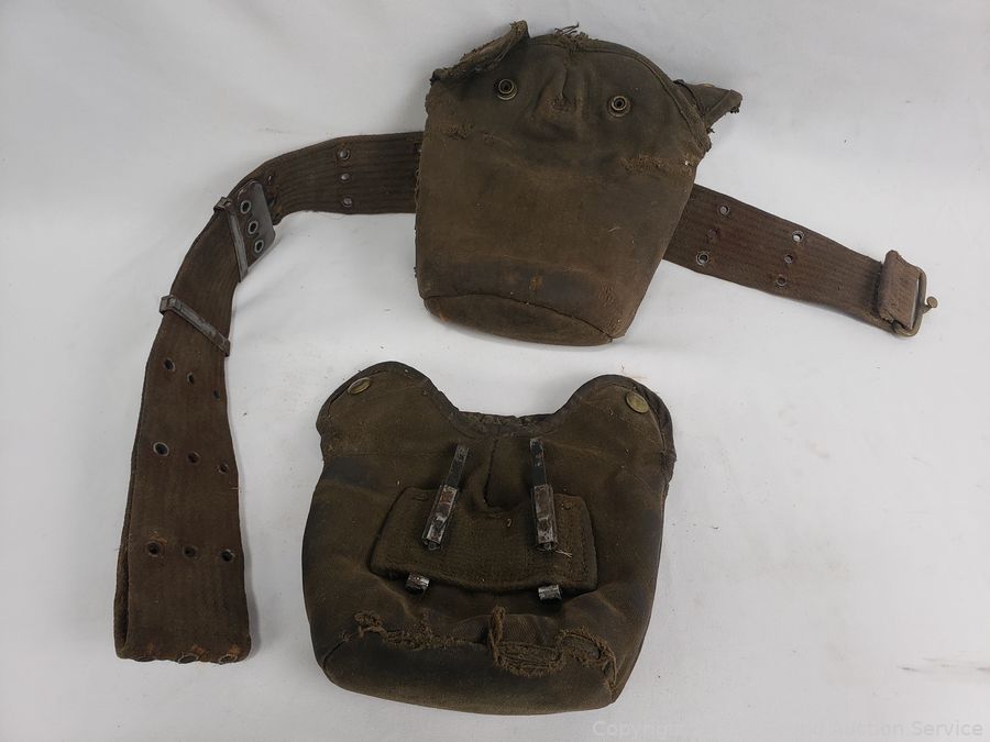 WWII canteen, canteen vest, duffle bag. Refer to photos for lot contents, more details.