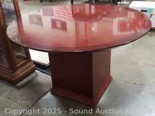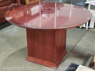 Has some old tape residue on edge of tabletop. Overall good condition. 29.5" H x 48" Dia.