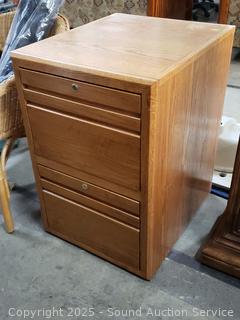 Appears to be all wood construction, ball bearing drawer guides. Locking with keys. Some scuffs, wear to finish. Fits legal or standard files. 29.75" H x 20" W x 24.25" D.