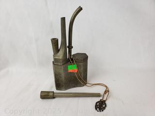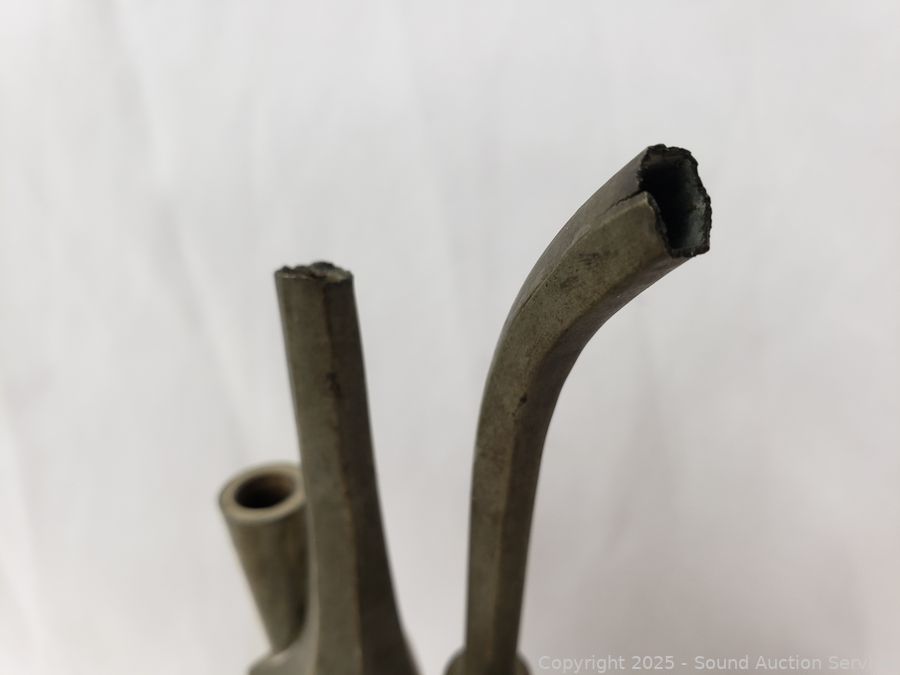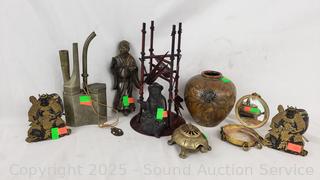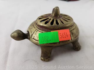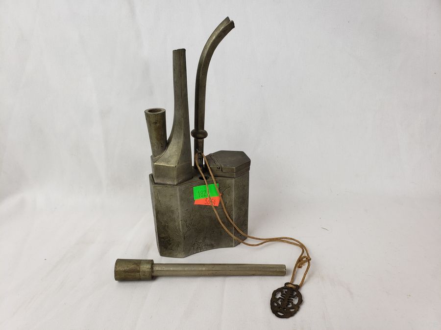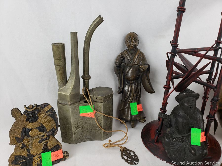 Chinese opium pipe, compact, bronze, cast metal figures, metal vase, turtle incense, candleholder, etc.