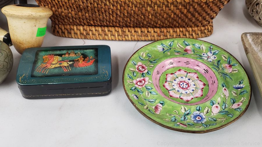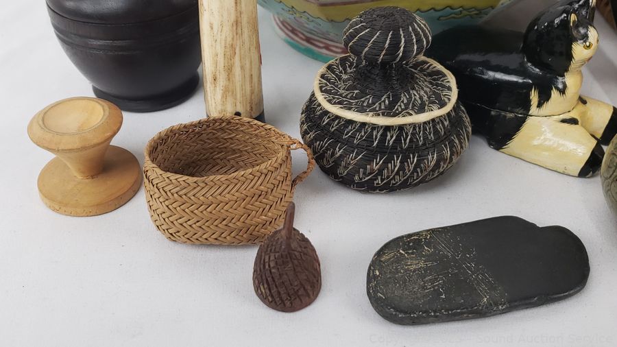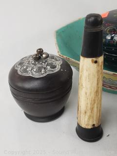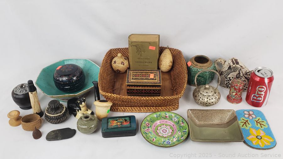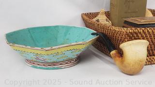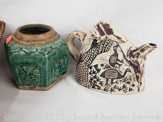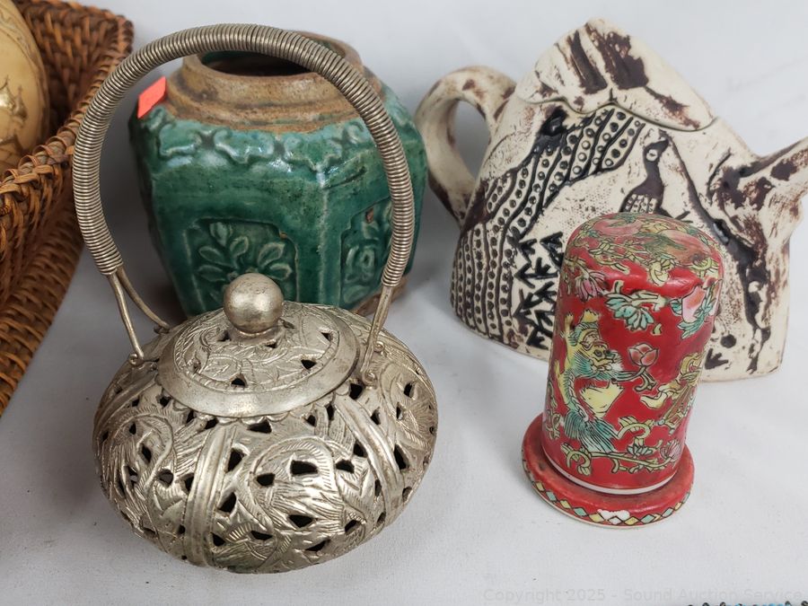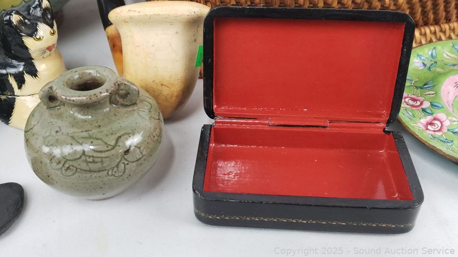 Small teapot, several small trinket boxes, sherlock pipe, pottery vase, etc. Refer to photos for lot contents, more details.