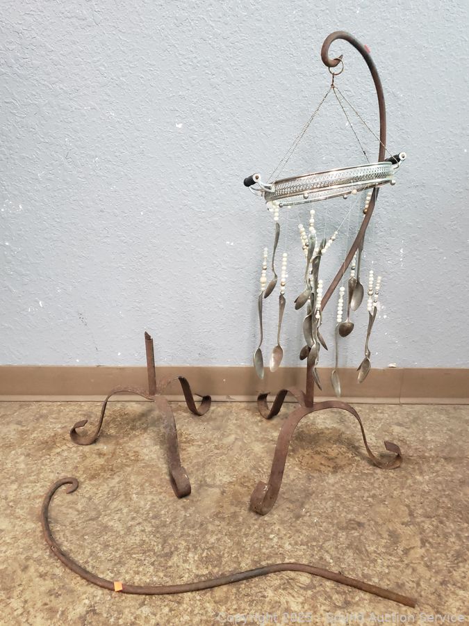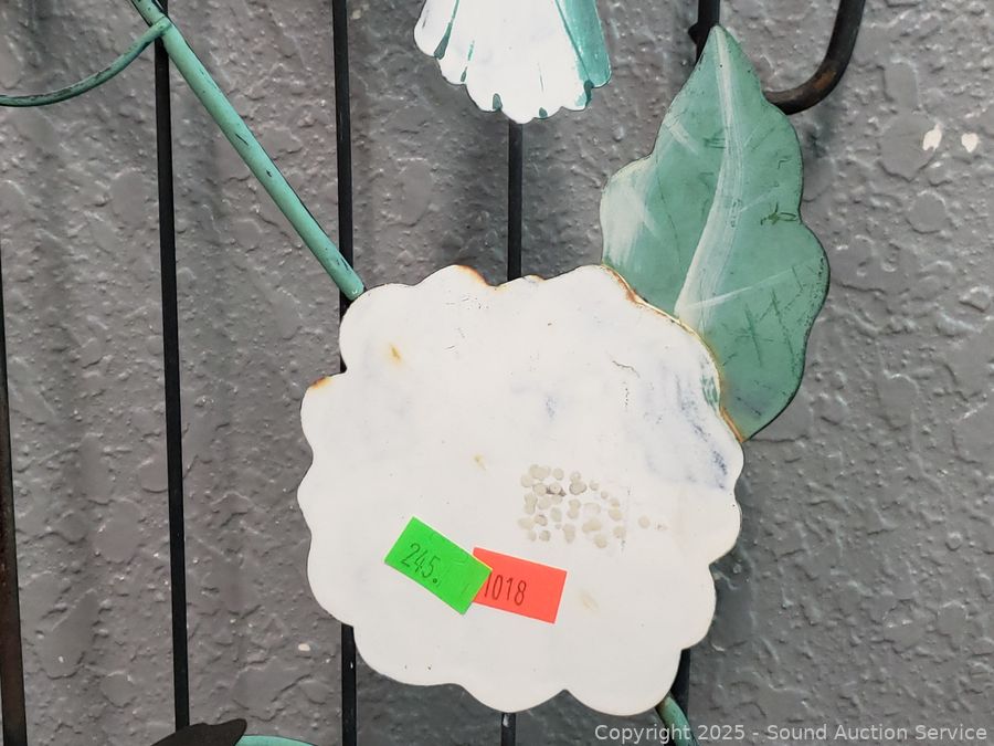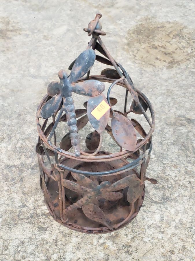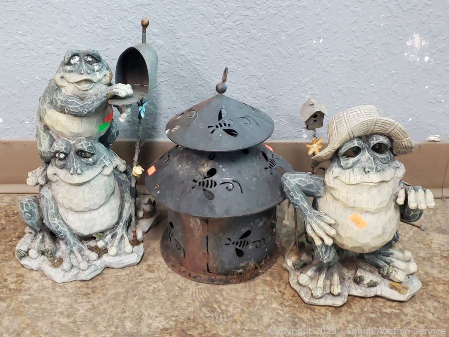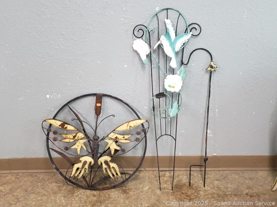 30" Shepard hook, painted metal trellis, pot hanger, frog statuary, candle lanterns, etc. Refer to photos for lot contents, more details.