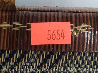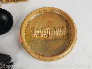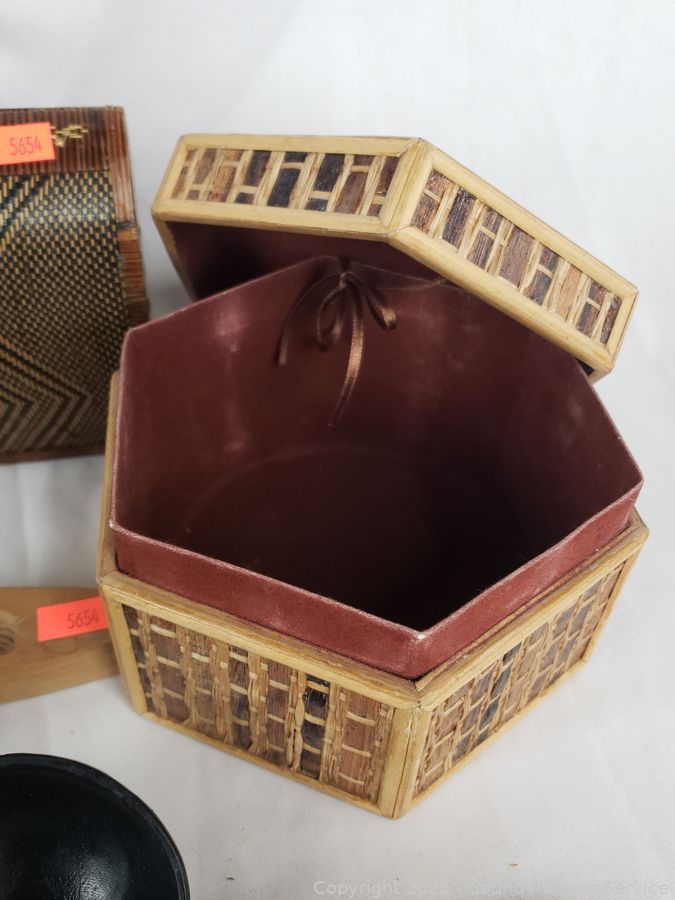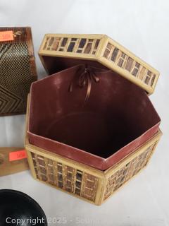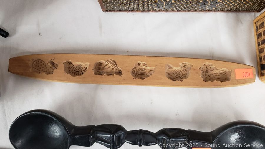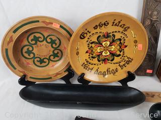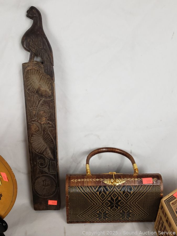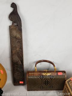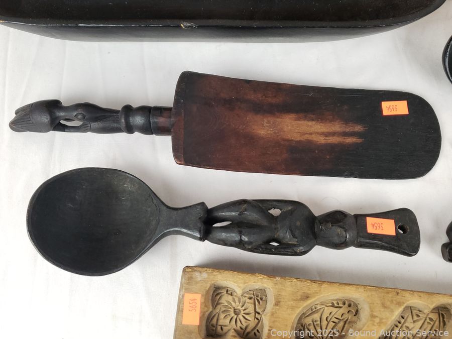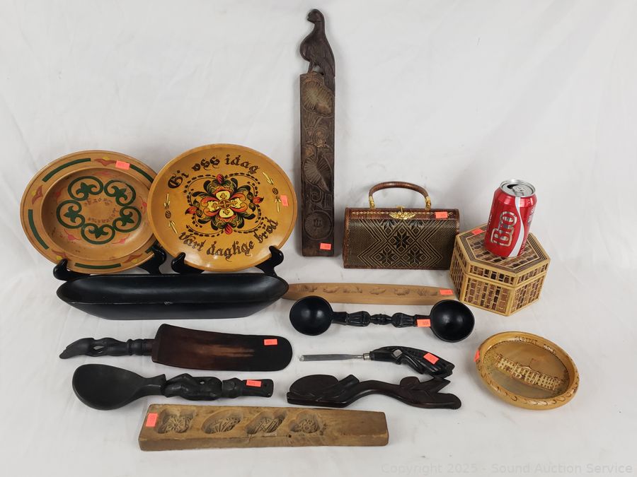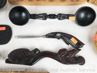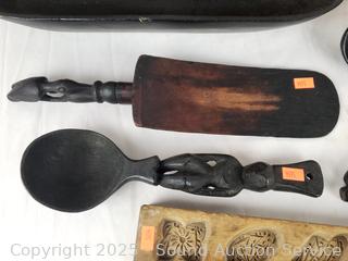 Carved wood utensils, elongated wood dish, carved wood molds, woven trinket box, intricately woven clutch, wood bowls, plates. Refer to photos for more details.