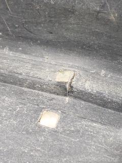 Solid 16" tires, 10" H x 30" x 43.5" bin, 29.5" from ground to top of bin. Signs of wear from use. Has a crack around 1 bolt in bed.