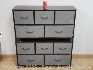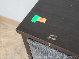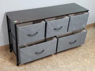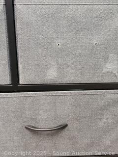 Metal framed, simulated wood grain finish, fabric drawers. 22" H x 39.5" W x 11.75" D. Don't see any major issues.