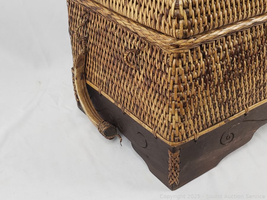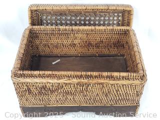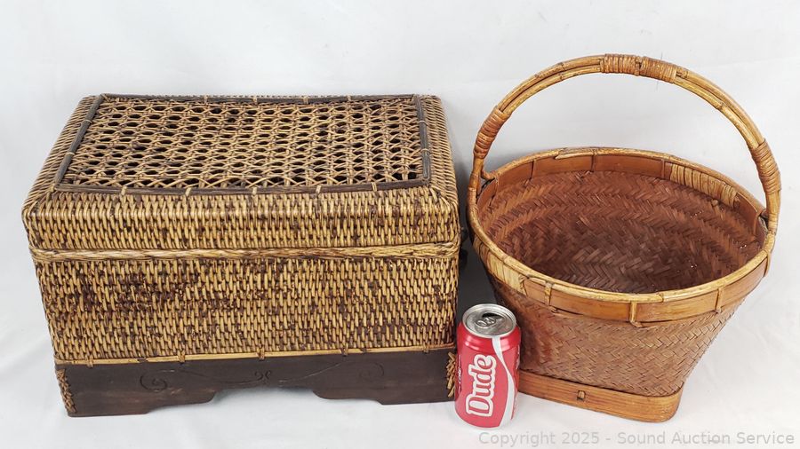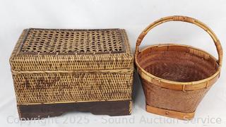 One is a chest with wood base & lid, has a broken handle, 10.5" H x 16" x 10". handled basket 14" H x 12" Dia.