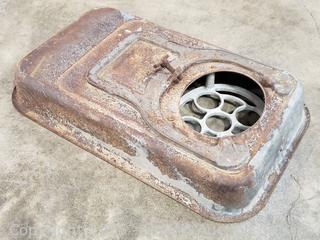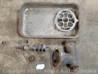 Grinder comes with grinding screw, unknown completeness, not sure what the pan is for. Various rust, wear to finish. 29" x 18".