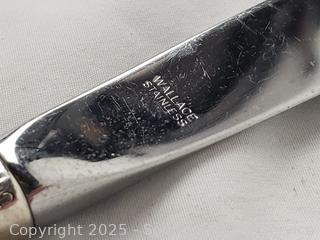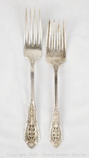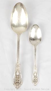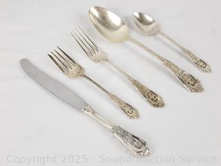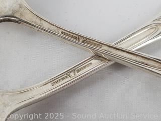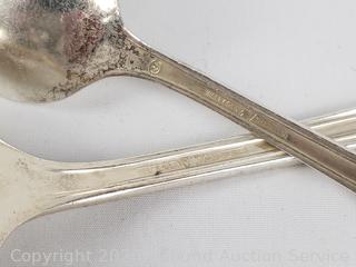 TW: 672g = 1LB 7.7oz = 23.7oz, weight does not include butterknives, some non-sterling weight. 6 Table Knives, 6 Large Forks TW: 280g = 9.8oz, 8 Sm. Forks TW: 276g = 9.7oz, 2 Sm. Spoons & 1 Lg. Serving Spoon TW: 112g = 4.0oz.