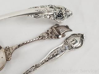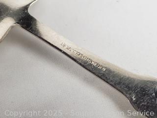 TW: 3148g = 6LB 15oz = 111.1oz. 12 Table Knives (sterling handle, did not weigh some non-sterling weight), 12 Lg. forks TW:1004g = 2LB 3.4oz = 35.4oz, 12 Sm. Forks TW: 534g = 1LB 2.8oz = 18.8oz, 12Sm. Spoons TW: 410g = 14.5oz, 11 Spreaders TW: 360g = 12.7oz, 10 Appetizer Forks TW: 250g = 8.8oz, 16 Serving Utensils TW: 588g = 1LB4.8oz = 20.8oz, Carving Knife & Spike & Claw Grabber (Did not weigh some non-sterling weight).