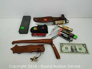 Lot #0009: (5) Vtg. Knives, Sheaths & Sharpening Stone