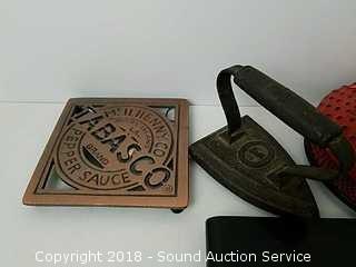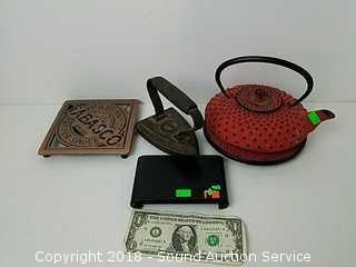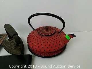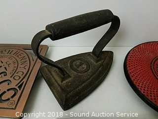 Lot #0200: Antique Sad Iron & Cast Iron Teapot w/Trivets