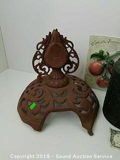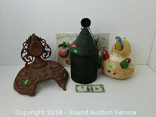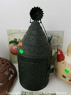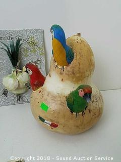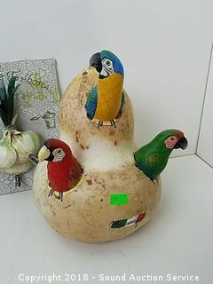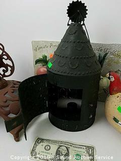 Lot #0218: Fairy Light Lantern, Cast Iron Lid & Parrot Decor
