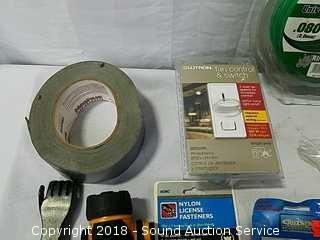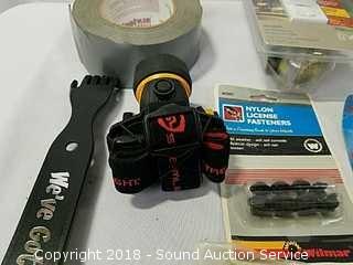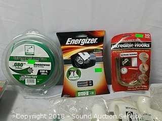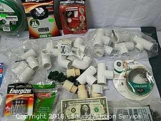 Includes: PVC piping, energizer LED headlamps, roll of duct tape, batteries, weed eater line, shelving brackets, and more.