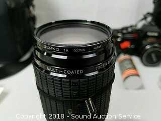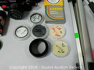 Comes with Konica Gemco Sigma Zoom 1:4.5 F=70 210mm, multi-coated lens, in excellent condition. Also includes: MX-130 tripod, (7) Tiffen lenses, manual and more.