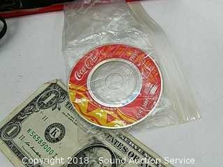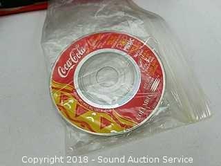 Model OTR-1949. Approx. 9-1/2" tall, 12" wide, and 9" deep. Tested, works. Also co.es with a Coca-Cola mini music disc.