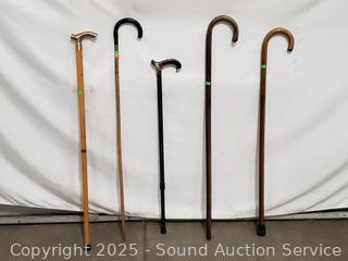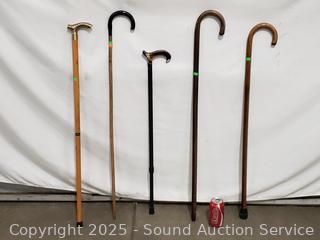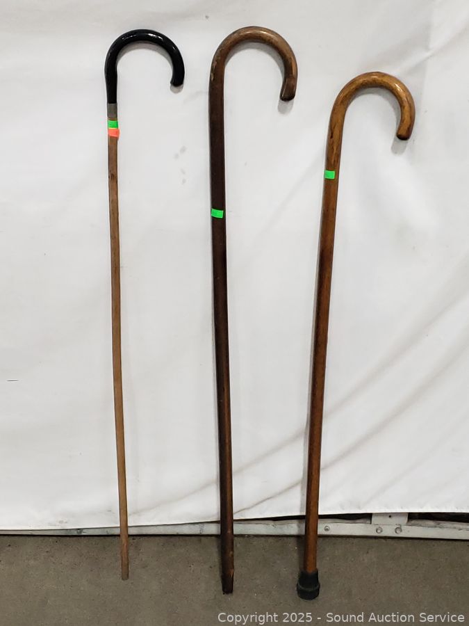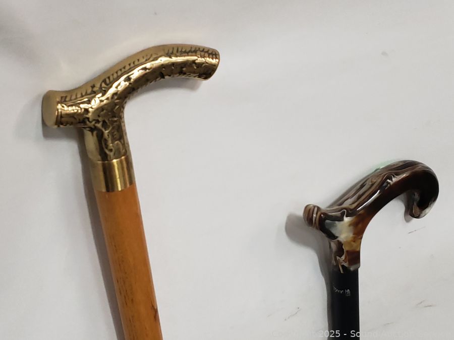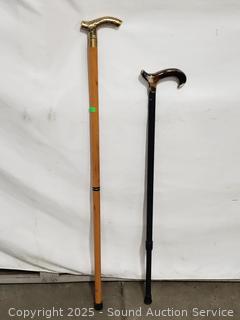 One is Fayet telescopic, brass handled one has a hidden stash in handle. Approx. 34" to 36" lengths.
