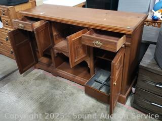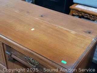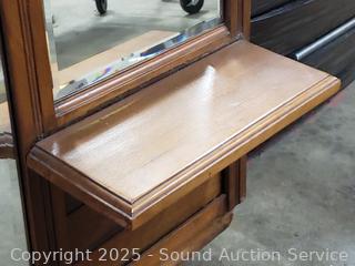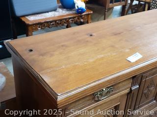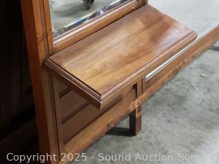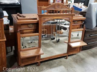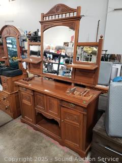 c.Late 1800's. Solid wood construction, believe it to be walnut, skeleton key locks with key, center cabinet is missing locking mechanism. Beveled mirrors, mirror frame and shelves have issues, missing pieces, shelf screws are stripped causing them to sag. Sideboard itself is in great condition. Approx. 36.5" H x 59" W x 19.5" D sideboard, 44.5" H x 57.5" W mirrored topper.