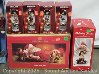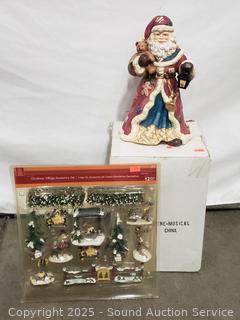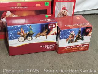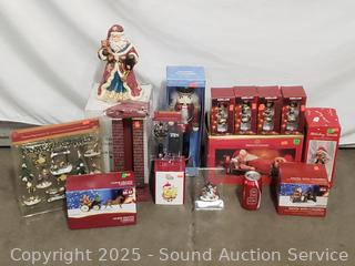 Most all in original packaging. porcelain musical Santa figure (works), horse drawn carriage, nutcracker, Spongebob ornament, waterglobe ornaments, Christmas village accessory set, animated snoring Santa (not functioning), Santa w/children, etc. Refer to photos for lot contents, more details.