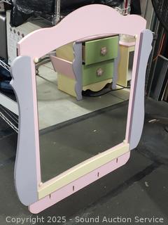 Floral pulls. Some scuffs, wear to finish, overall good condition. Pressboard construction. 30" H x 48" W x 16.5" D dresser, 40" H x 34" W mirror. Matches the next few lots.