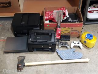 Splitting maul, old untested printers, grilling utensils, Ulanzi photography lights, etc. Refer to photos for lot contents, more details.