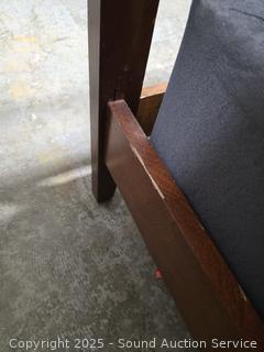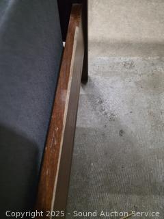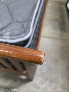 American Beauty 13" pillowtop mattress. Mattress the previous & next few lots. 36-3/8" to 44-1/2" H x 79-3/4" W headboard & footboard, 90" length. Some scratches & scuffs, veneer on top pf siderail is coming off. Mattress in great condition. Overall good condition.
