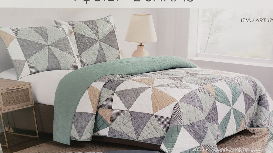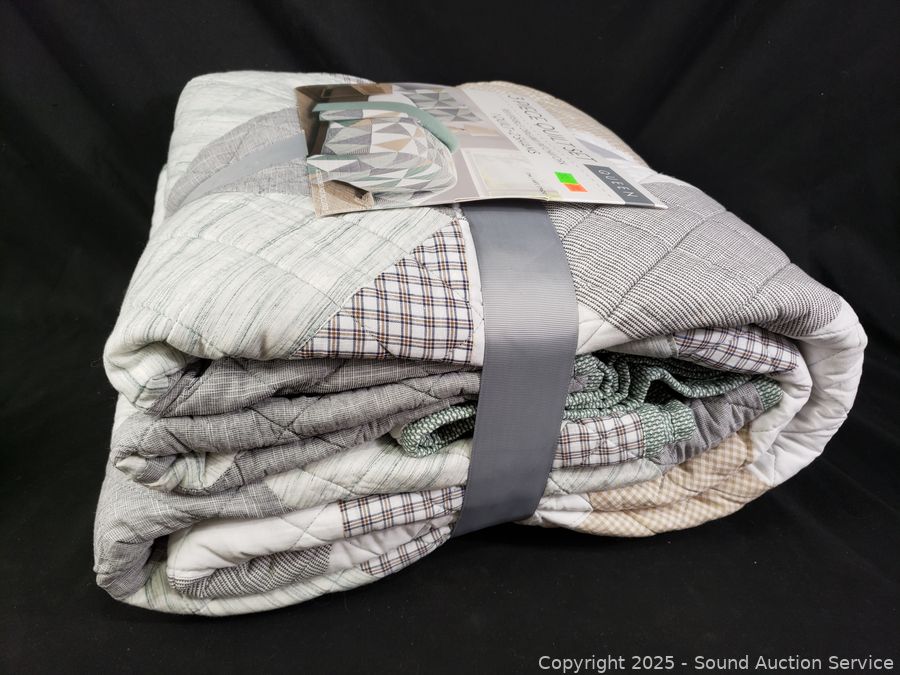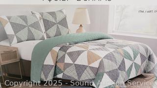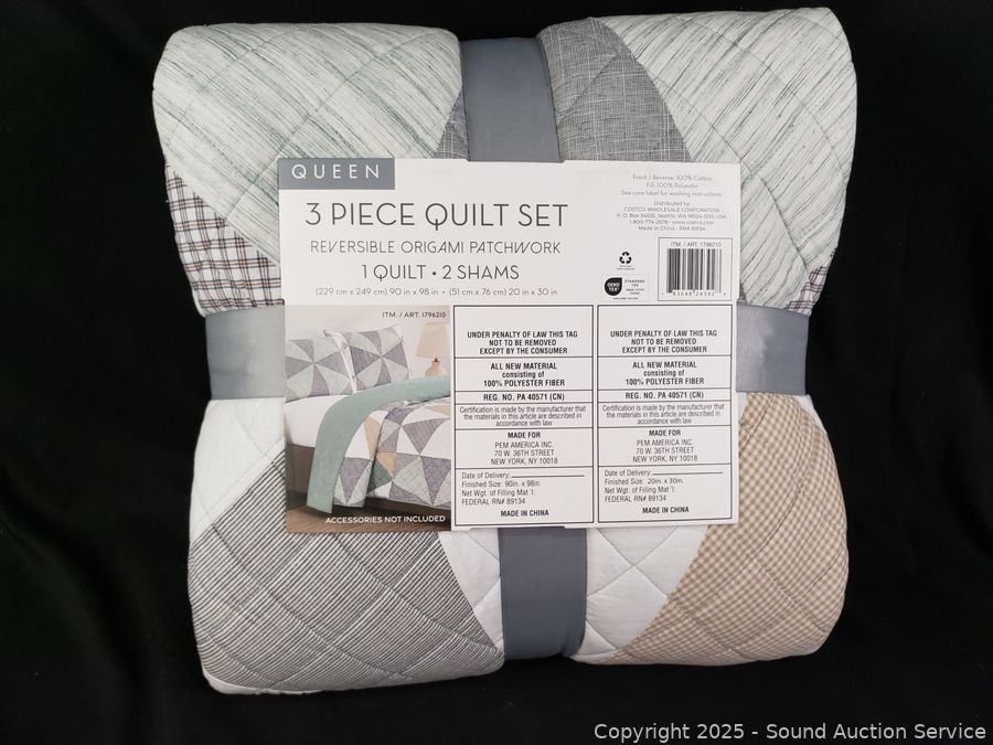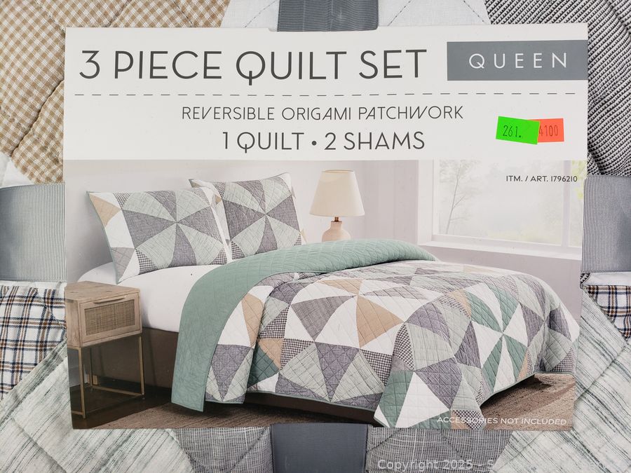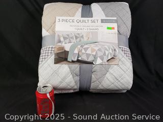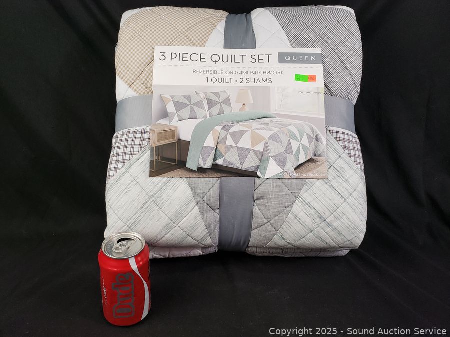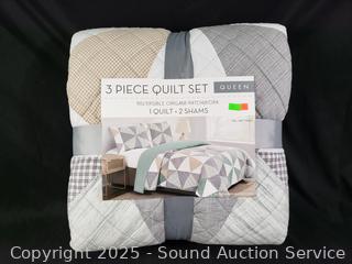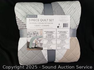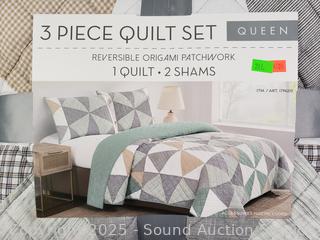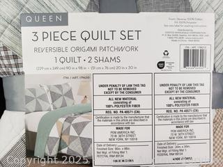 Lot #0261: 3pc Reversible Origami Patchwork Queen Quilt Set