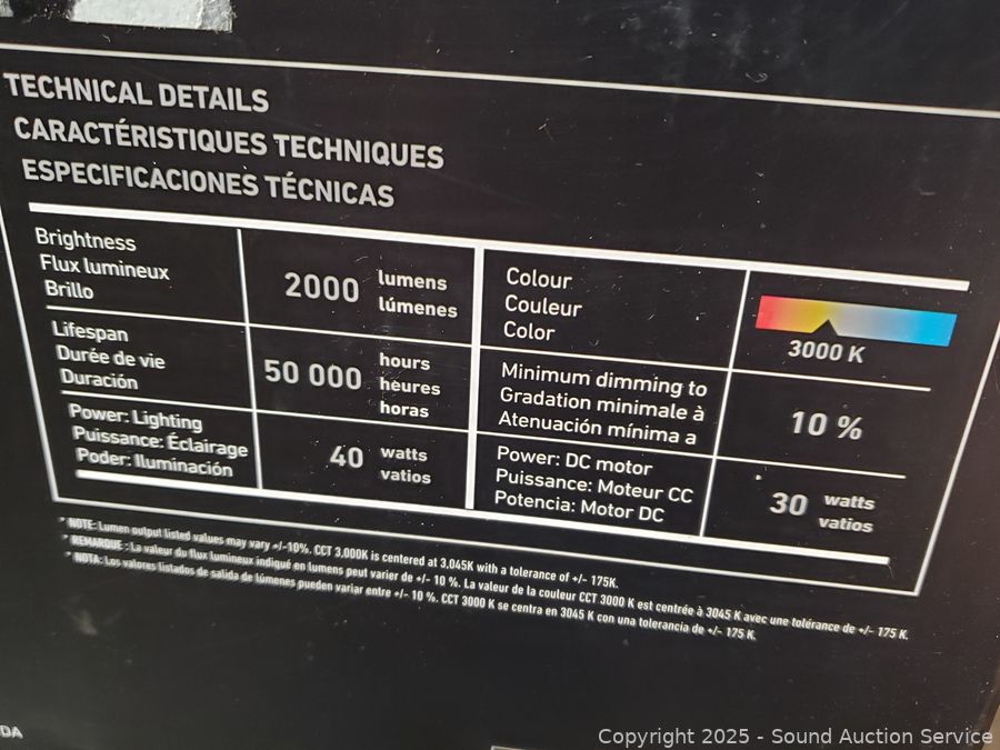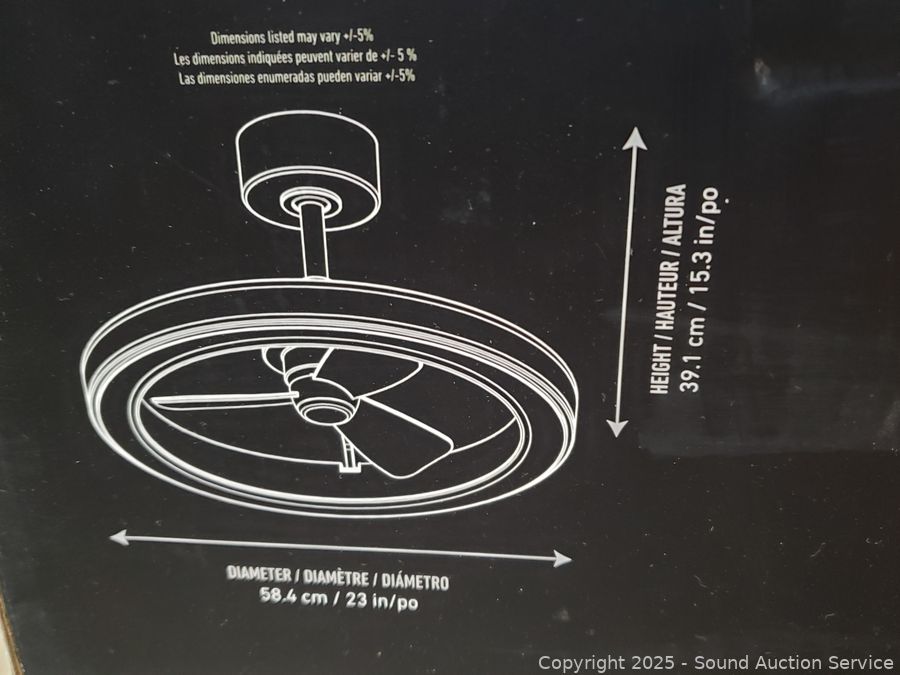 23" Dia. x 15.3" H. Has power, appears to be functioning as intended, complete. 30W, 2000LM, 3000K.