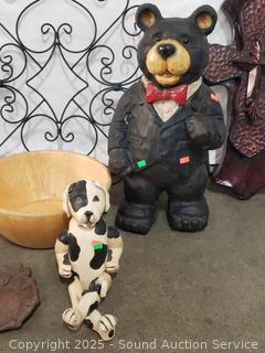 Wrought Iron Wall Decor, Articulating Dog & Ceramic? Bear - Bear has some damage. 15" dog, 20" bear, 24" metal wall decor.