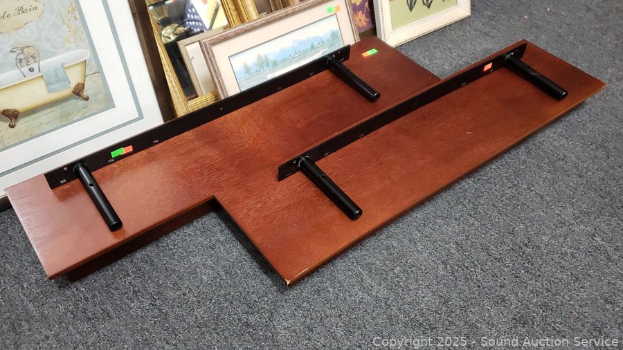 Other than screws shelves appear complete, one has a ding on corner. 2.5" x 30" x 7.5". 15" x 8.5" mirrors, 17.5" x 15.5" to 13" x 11" artwork. Refer to photos for more details.
