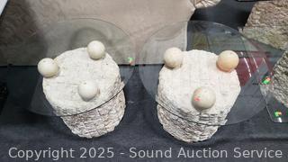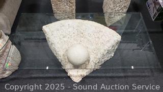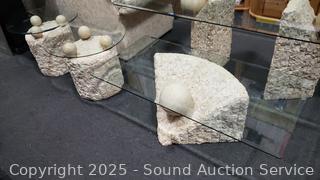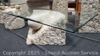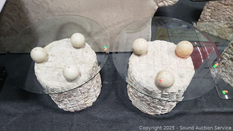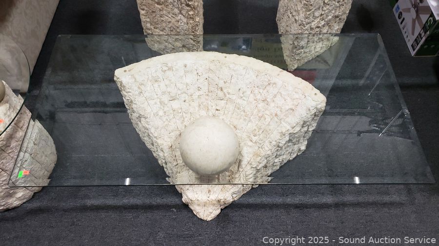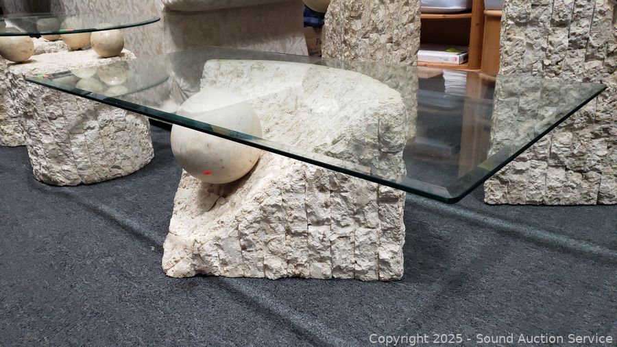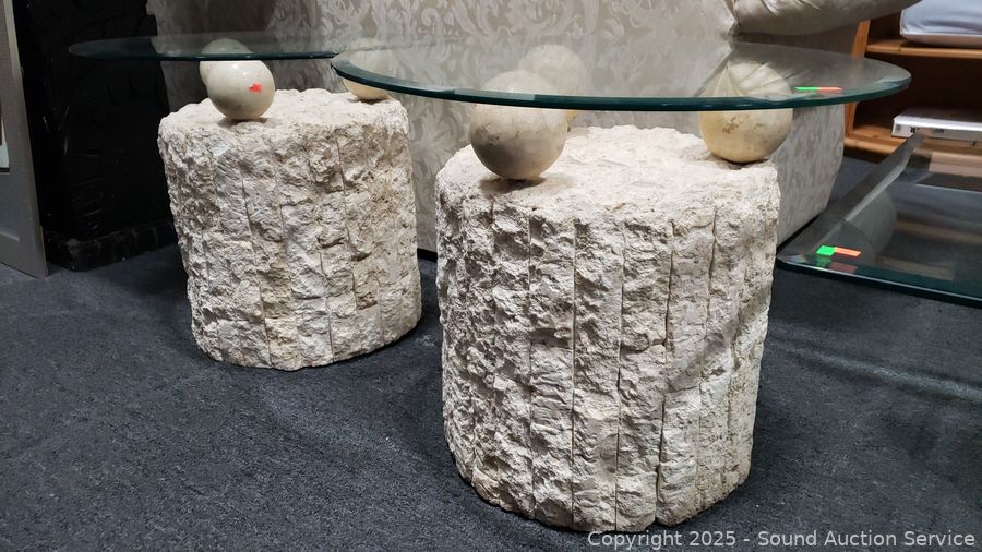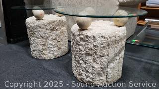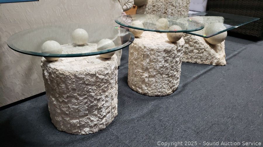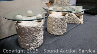 In excellent condition. Bases are made to look like sculpted stone, not sure what it is made from. Coffee table 16.5" H x 52" x 26", end tables 21.25" H x 26" Dia. Don't see any major issues. Matches the next lot.