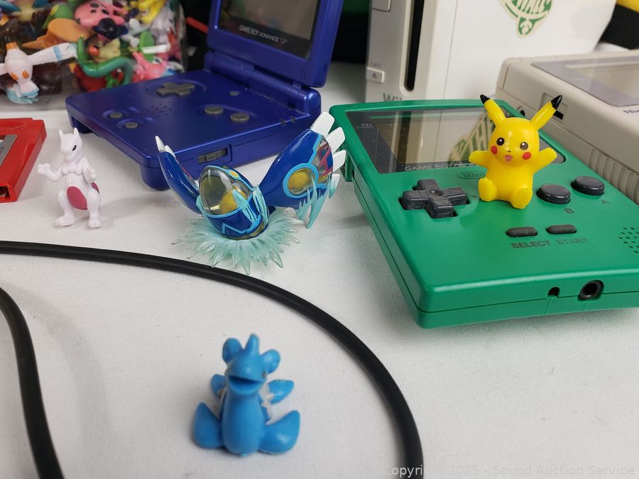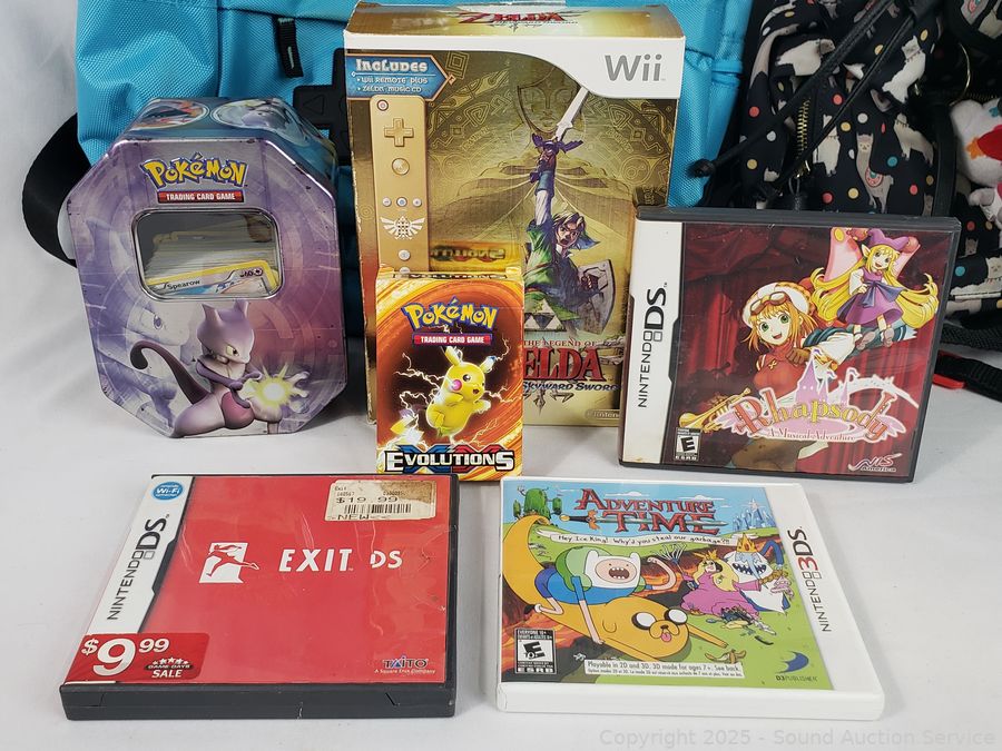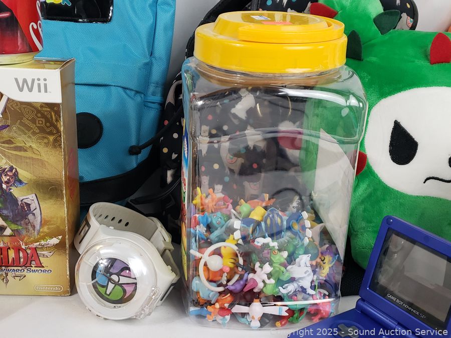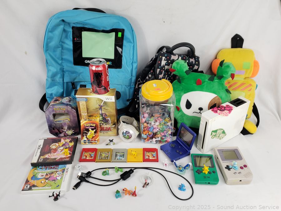 Original Gameboy, Gameboy Pocket, Gameboy Advanced (all but the original have power, original couldn't get to work), 5 Pokémon games, Pokémon Trading Cards & Tin, Pokémon Miniature Figures, Zelda Gold Wii Game, Wii Game Console (some stickers, untested, console only, no cables), 3 Nintendo DS Games, Nintendo Gameboy Color Backpack, Lama backpack & 2 plushie backpacks. Refer to photos for lot contents, more details.