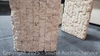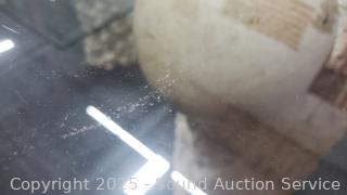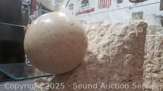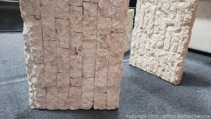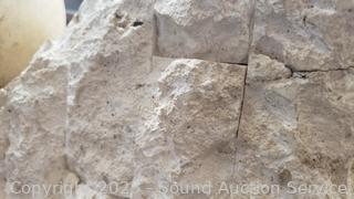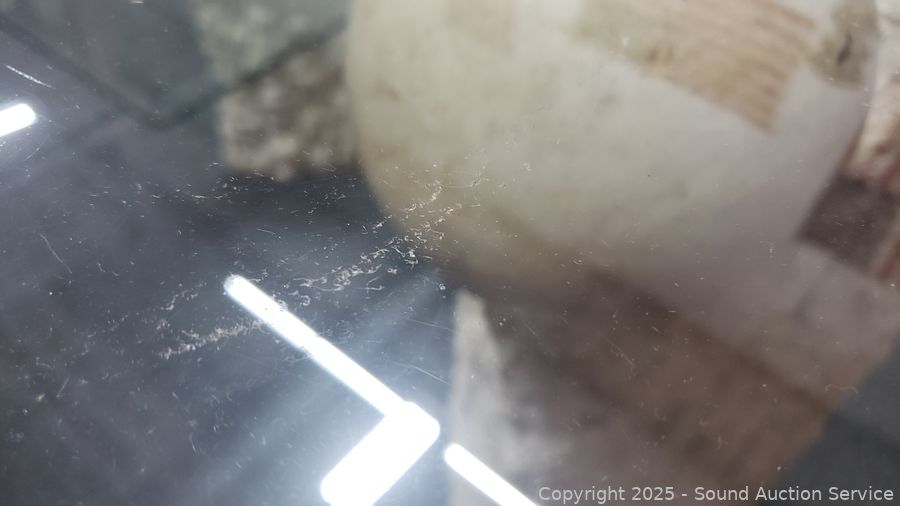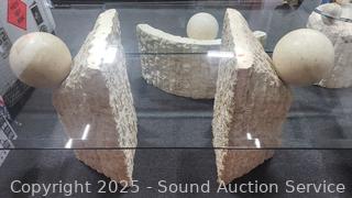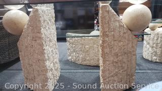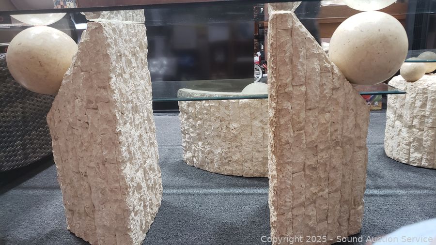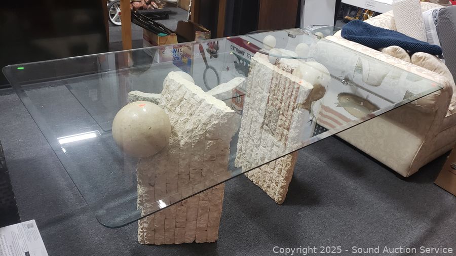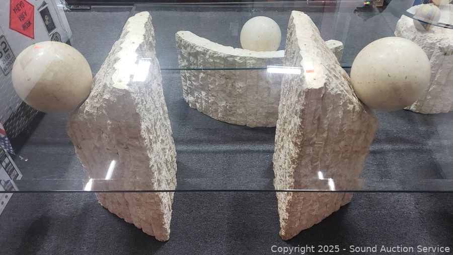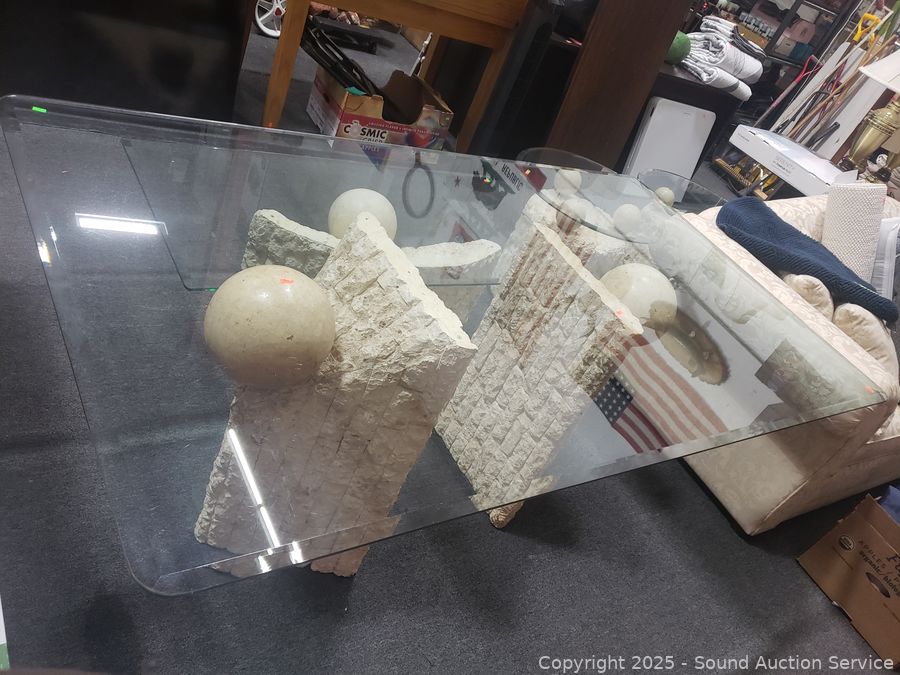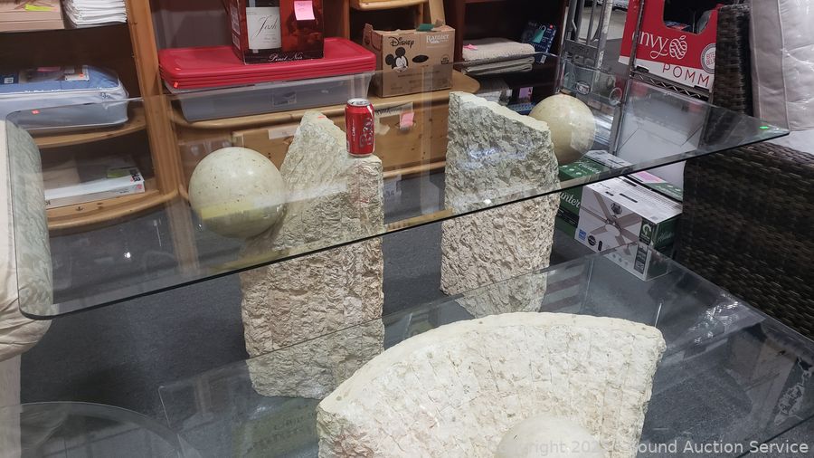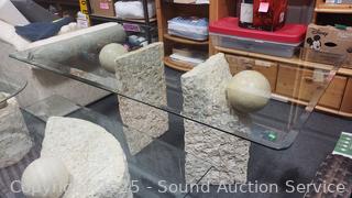 Consignor used it as a desk, could be used a desk or dining table. Base is made to look like sculpted stone, not sure what it is made from. Don't see any issues. Approx. 29.25" H x 71.5" L x 41.25" W.