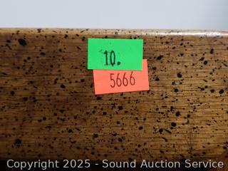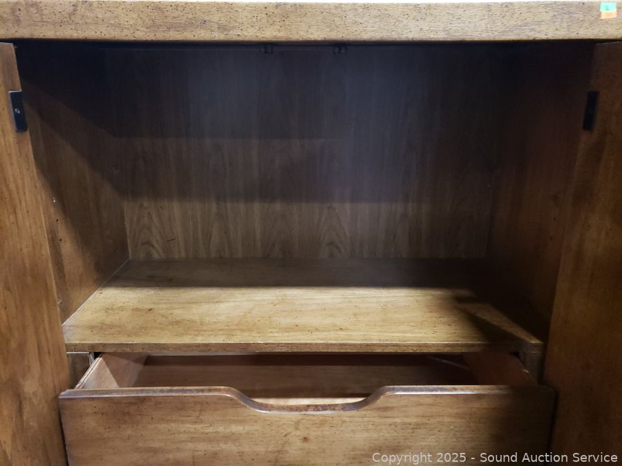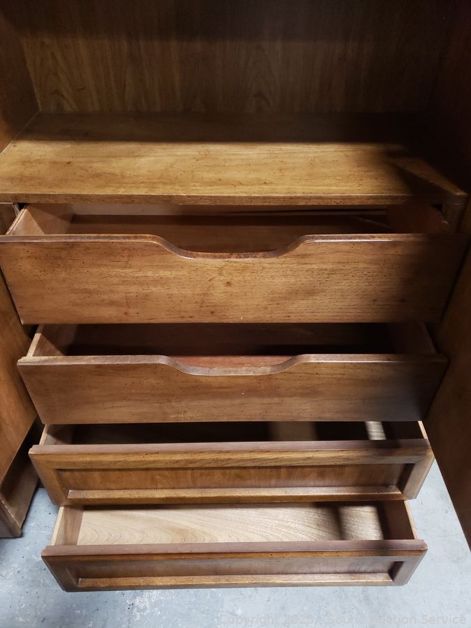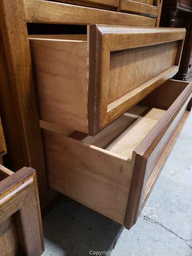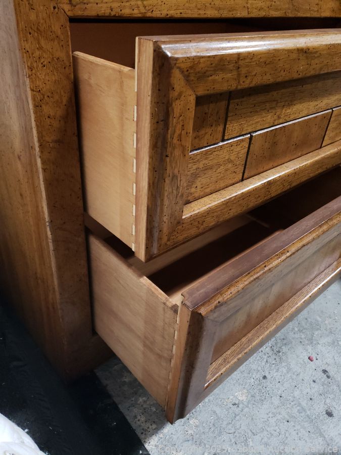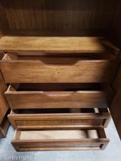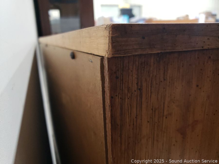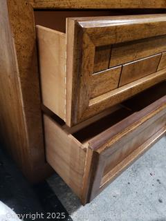 Dresser is missing inner shelf, has a 4" x 1/2" chip on the bottom right corner. Approx. 62" H x 38" W x 19" D dresser, 24" H x 26" W x 17" D.