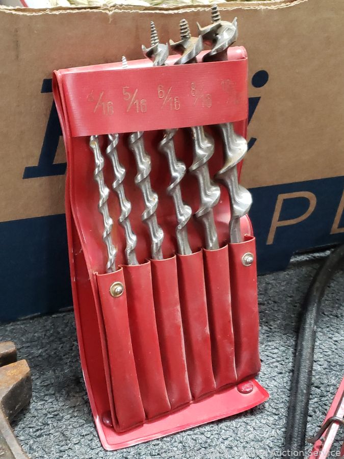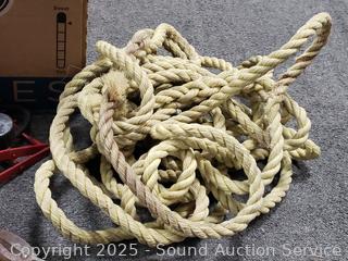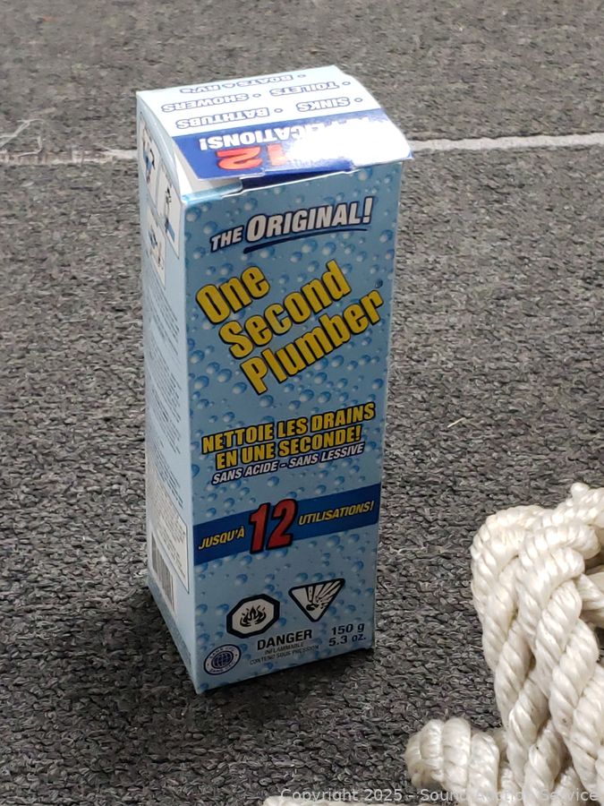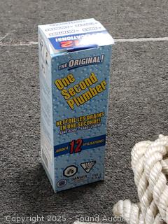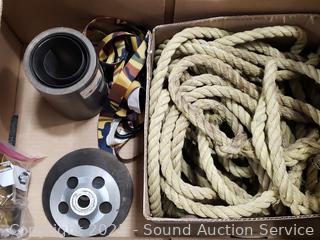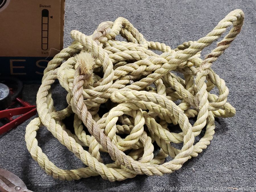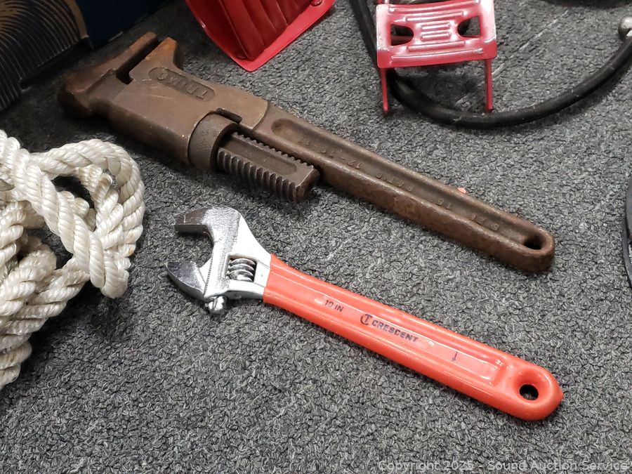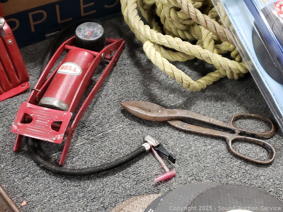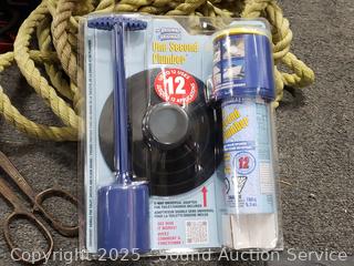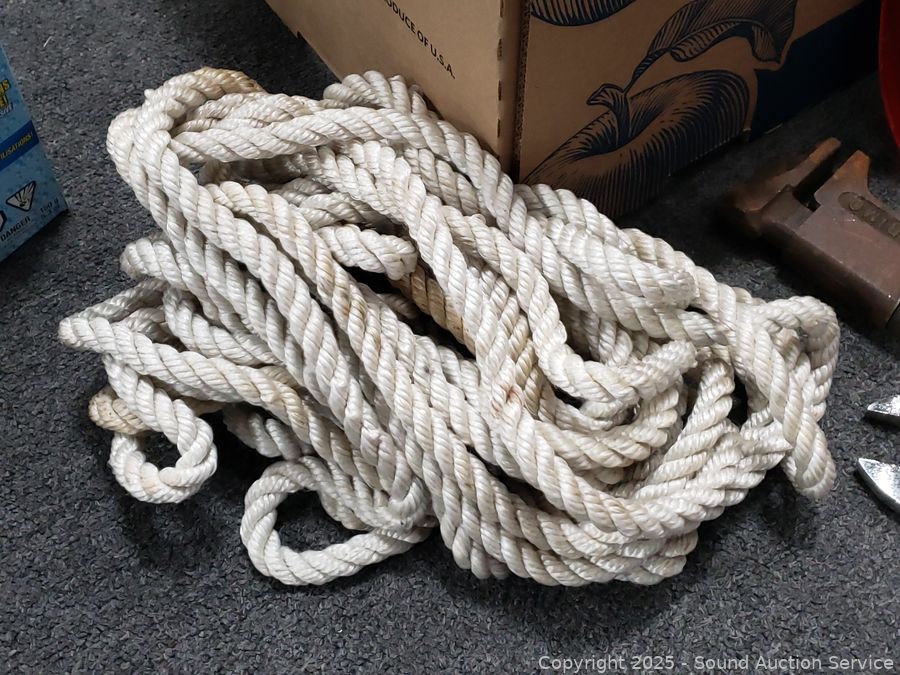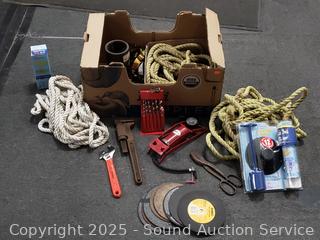 5/8" by unknown lengths of rope. bicycle foot pump, wrenches, roll of flashing, drill bits, cutoff discs, etc. Refer to photos for more details.