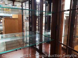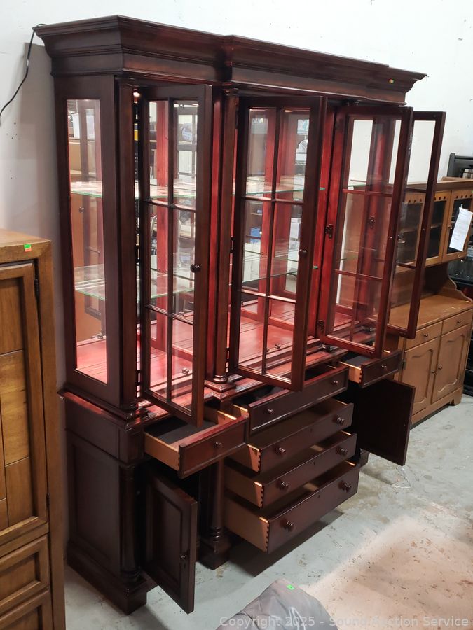 Top drawer is silver cloth lined with flatware organizer. 2pc for easy travel. Glass shelves with plate grooves. 6 drawers and 2 lower cabinets. Comes with a spare bulb. 88" H x 74" W x 20" D.