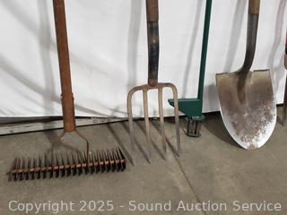 Loppers, thatch rake, potato fork, spade shovel, garden cultivator, shovel. Signs of wear from use.